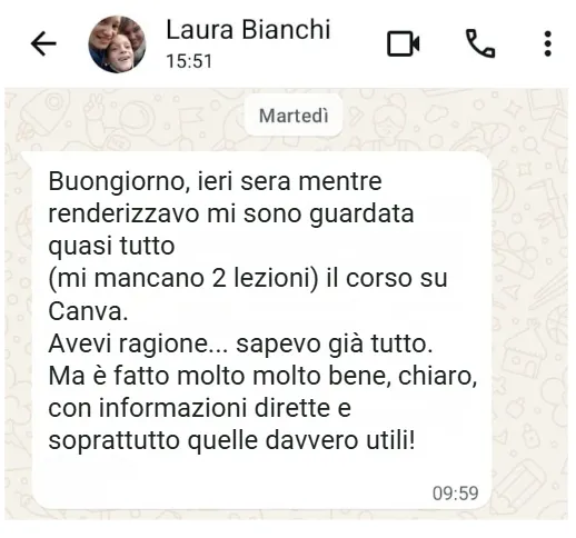 Inoltre, entrando nel corso avrai accesso al gruppo WhatsApp riservato, dove riceverai aggiornamenti su eventuali novità di Canva e potrai continuare a imparare insieme agli altri partecipanti.